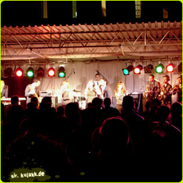 | Den Beginn macht die elfköpfige Formation Skambiance aus Brüssel: knalliger Ska mit schwerem Gebläse sorgt gleich für einen furiosen Einstieg ins Open-Air. Skambiance spielen nicht nur virtuos, auch ihre Bühnenshow ist schon Programm für sich und ihre Auftritte stets ein sicherer Partygarant. Fünf Stunden Livemusik mit Bands aus dem europäischen Ausland und dazu das fulminante Feuerwerk auf dem Rhein, schöner kann man einen Montagabend kaum verbringen. Und preiswerter auch nicht: der Eintritt ist frei. |